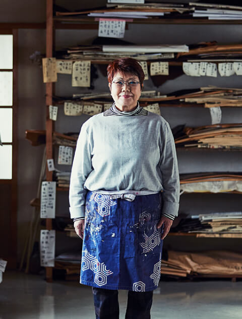 山元染工場三代目代表。20歳で嫁に来てから、初代山元光から技術を教わり、衣裳を制作してきました。山元染工場の歴史を大切にし、息子夫婦に繋げてきました。何十年も前に彫られたような古い型紙を扱うなど難易度の高いことを担当します。初代から受け継いだ濡れしごきの技を駆使して染め作業をしています。